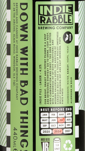 Indie Rabble step into classic territory while keeping their indie edge.The body is lean, the hops grassy and herbal, and a touch of biscuit malt adds depth without weighing it down. Carbonation gives it bite and the finish snaps clean. Straight down the line where it counts, but with a bit of indie swagger at the edges.